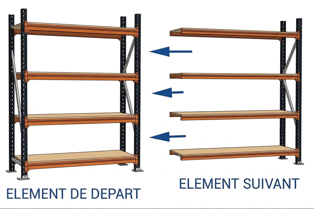 Le système est disponible en éléments de départ et suivants, permettant de créer facilement des lignes de rayonnage évolutives selon vos contraintes d’espace et de stockage. Il convient parfaitement pour les entrepôts logistiques, plateformes de distribution, réserves de magasins ou ateliers de production.
